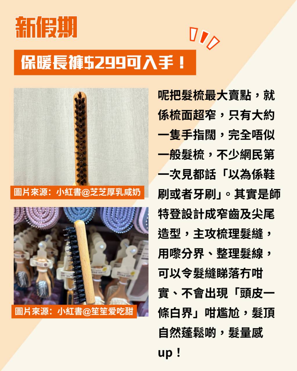 呢把髮梳最大賣點,就係梳面超窄,只有大約一隻手指闊,完全唔似一般髮梳,不少網民第一次見都話「以為係鞋刷或者牙刷」。其實是特登設計成窄齒及尖尾造型,主攻梳理髮縫,用嚟分界、整理髮線,可以令髮縫睇落冇咁實、不會出現「頭皮一條白界」咁尷尬,髮頂自然蓬鬆啲,髮量感up!