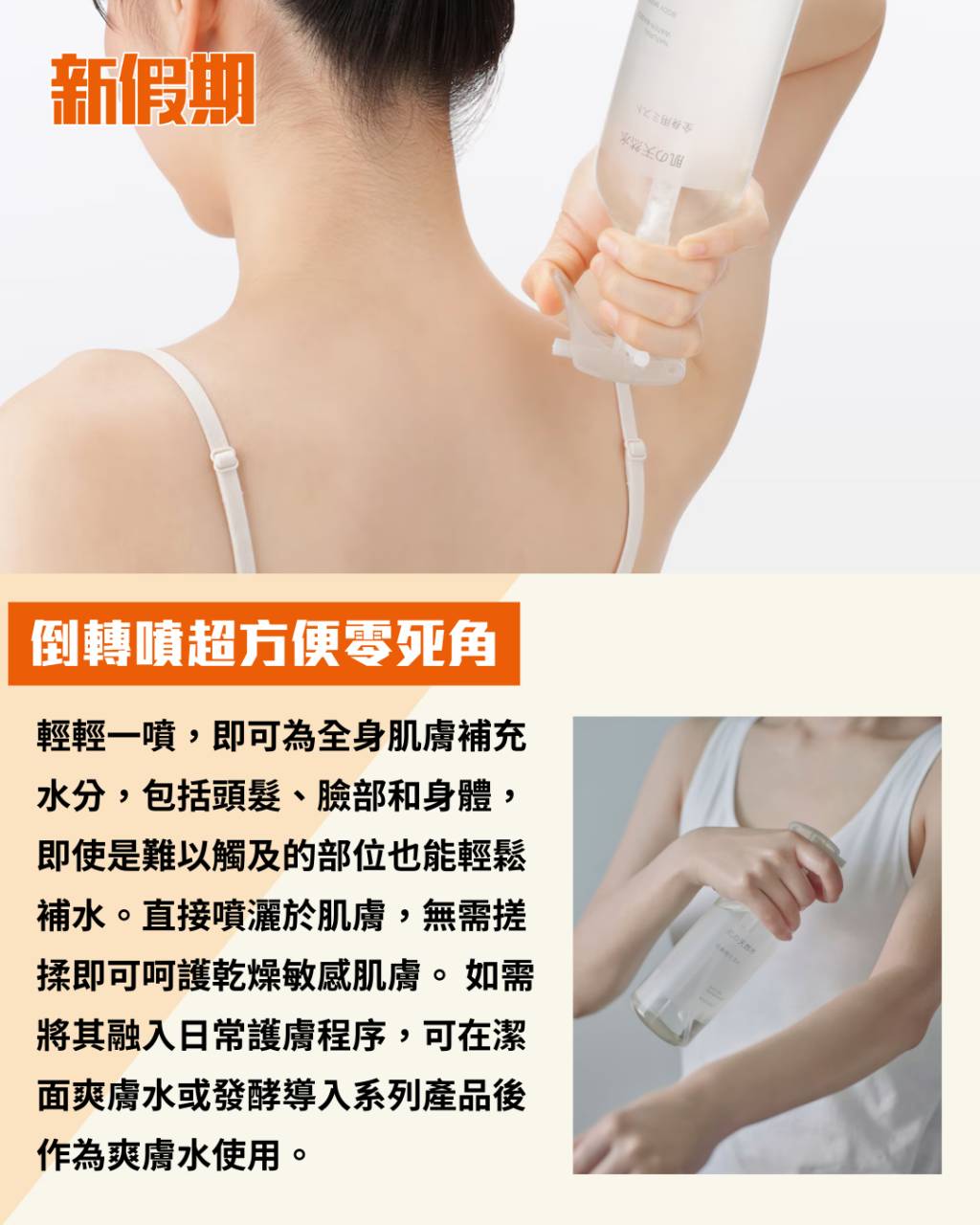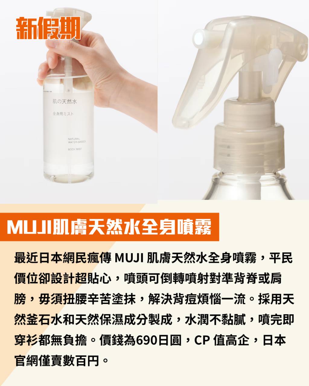 最近日本網民瘋傳 MUJI 肌膚天然水全身噴霧,平民價位卻設計超貼心,噴頭可倒轉噴射對準背脊或肩膀,毋須扭腰辛苦塗抹,解決背痘煩惱一流。採用天然釜石水和天然保濕成分製成,水潤不黏膩,噴完即穿衫都無負擔。價錢為690日圓,CP 值高企,日本官網僅賣數百円。