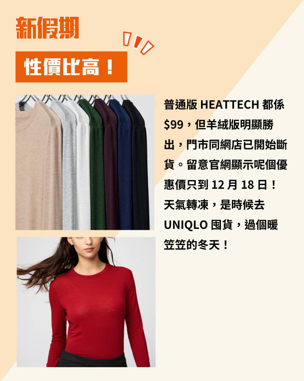 冬天一到,UNIQLO HEATTECH 保暖內衣就係大家衣櫃必備神器!最近網民發現一款隱藏版羊絨混紡保暖內衣,價錢竟然低至 $99,保暖度同親膚感完勝普通版,仲平過日本買,難怪大家「幾件幾件咁掃貨」!
