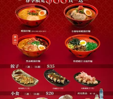 【春季限定 買一送一✨黑蒜蝦湯拉麵🍜 新登場】 拉麵餃子指定小食及所有…