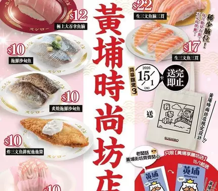 - 優惠詳情:開幕當日1月15日起來店用餐嘅客人,堂食消費滿$100,可免費獲贈黃埔時尚坊店特別版「萌抱壽司精美Tote Bag」乙個