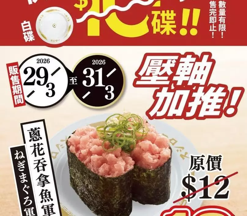 🔸【$10白碟快閃優惠】蔥花吞拿魚軍艦販售期間:3月29日~3月31日