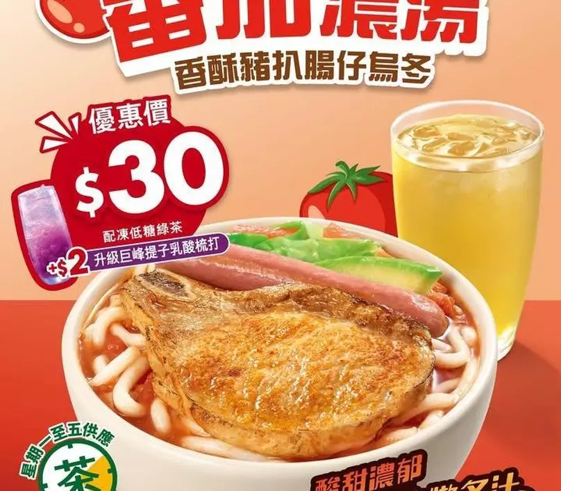 - 優惠詳情:Set includes pork chop, tomato soup, udon, and low-sugar green tea for only $30