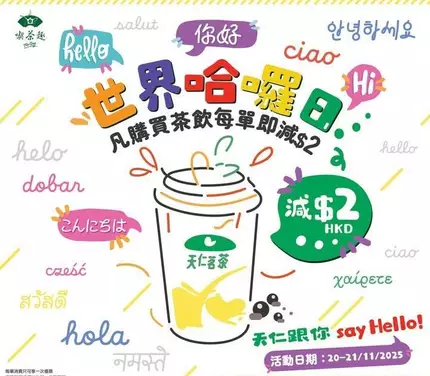 11月21日就是一年一度世界哈囉日了🤝天仁一連兩日先和大家致意,凡於20-21/11/2025號於門市購買茶飲,即享每筆消費減$2優惠🍃