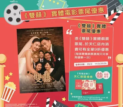 - 優惠詳情:憑《雙囍》實體戲票票尾,於全線香港天仁門市消費可享全單9折