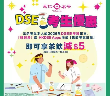 • 優惠詳情:向我們出示DSE準考證正本、「報到易」或「HKDSE」Apps內的「我的考試日程」版面,即可享茶飲減$5