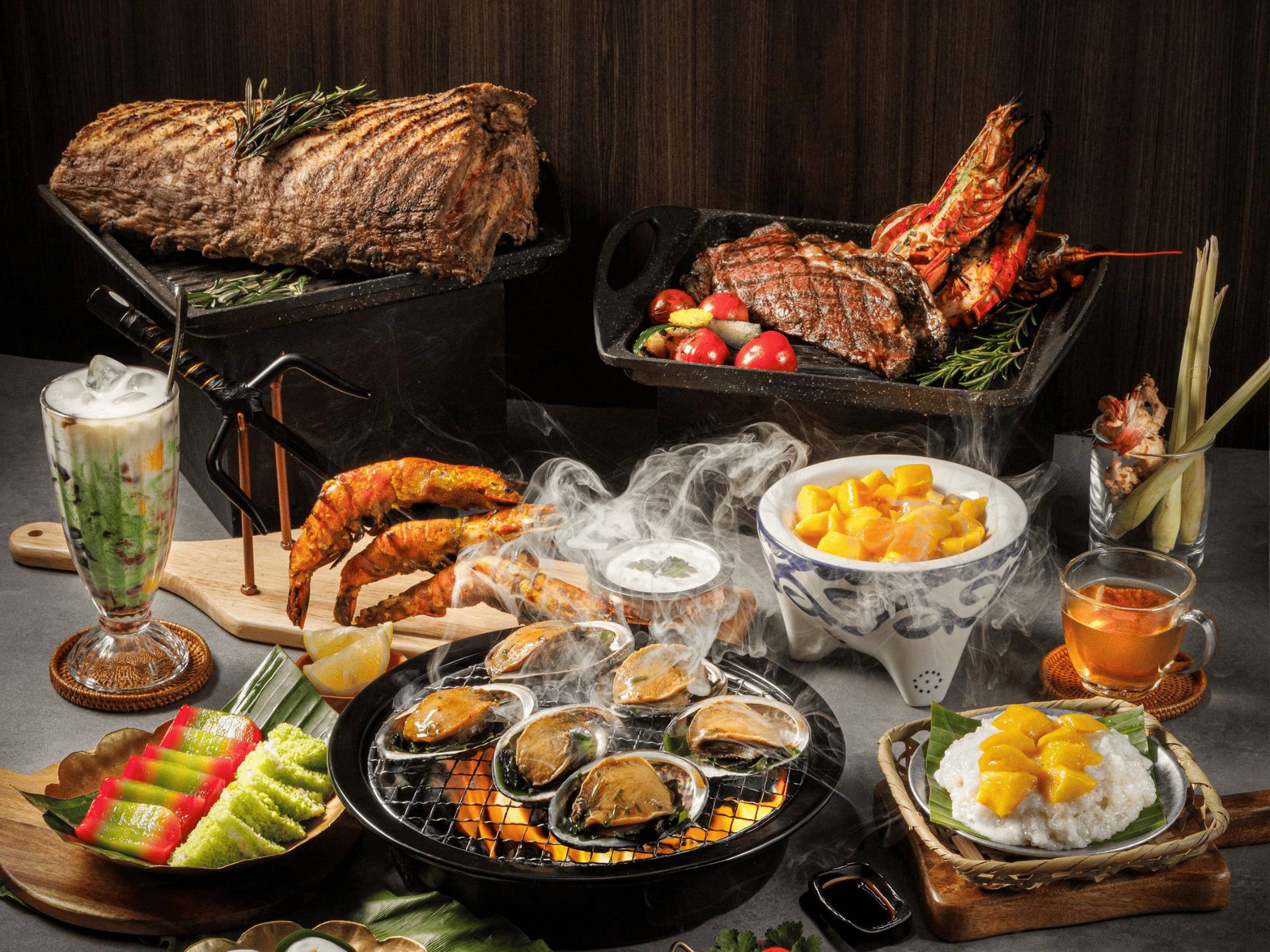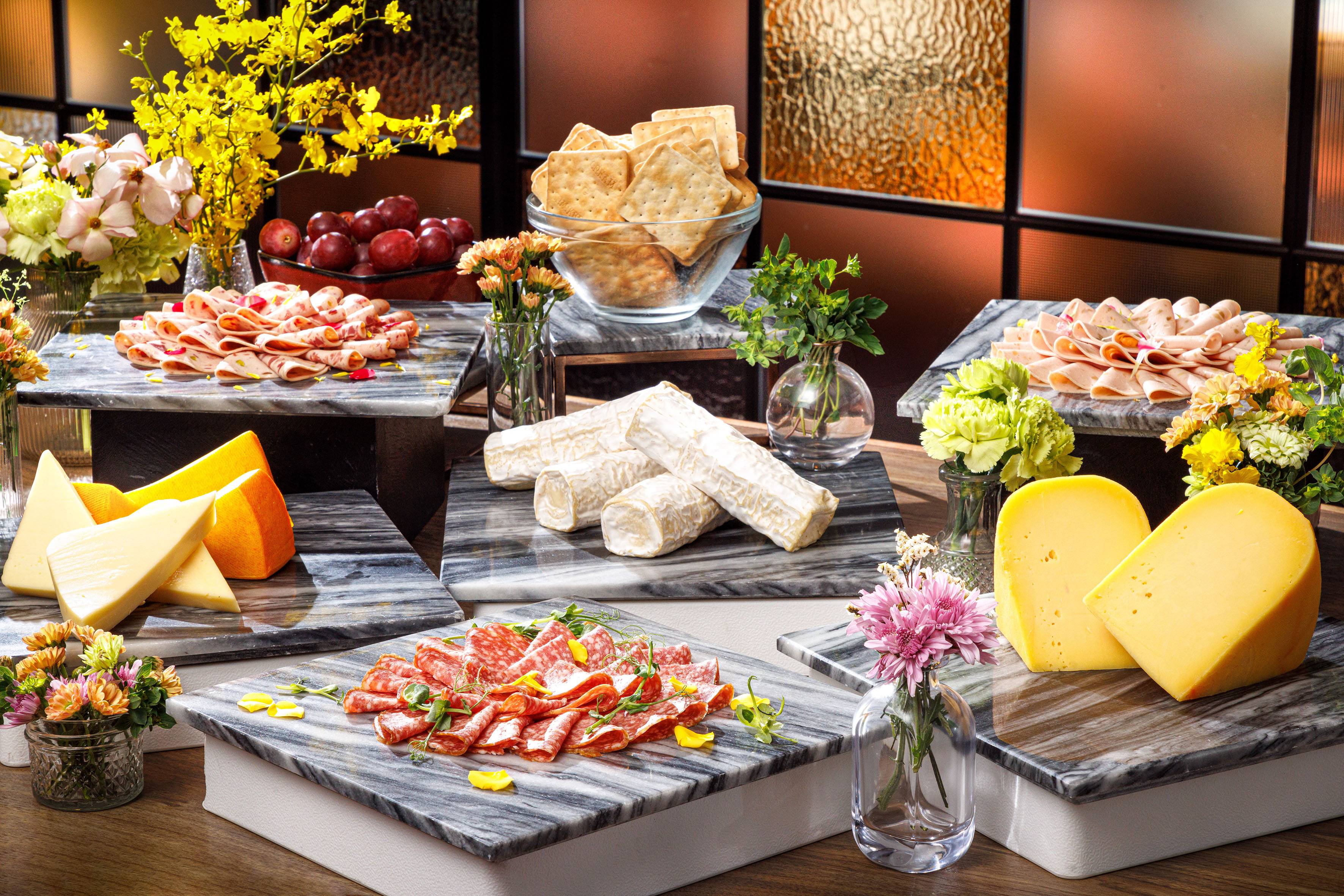 - 即席烹調:燒澳洲牛肉、香辣烤三文魚、黑松露奶油醬長通粉、印度烤雞