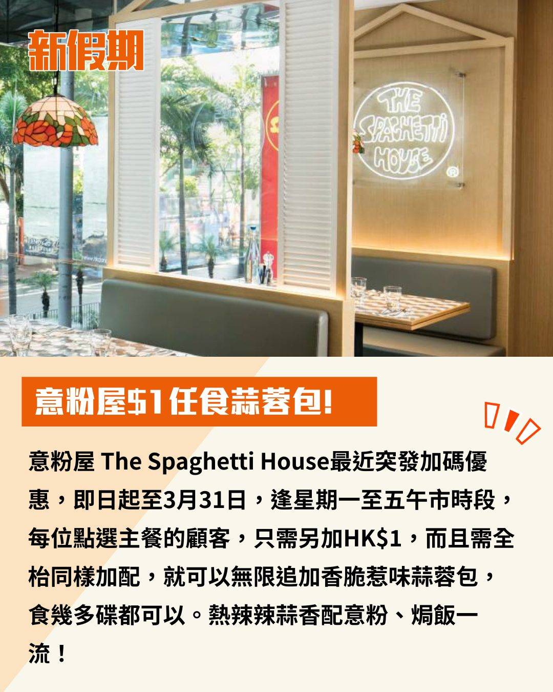 意粉屋 The Spaghetti House最近突發加碼優惠,即日起至3月31日,逢星期一至五午市時段,每位點選主餐的顧客,只需另加HK$1,而且需全枱同樣加配,就可以無限追加香脆惹味蒜蓉包,食幾多碟都可以。熱辣辣蒜香配意粉、焗飯一流!