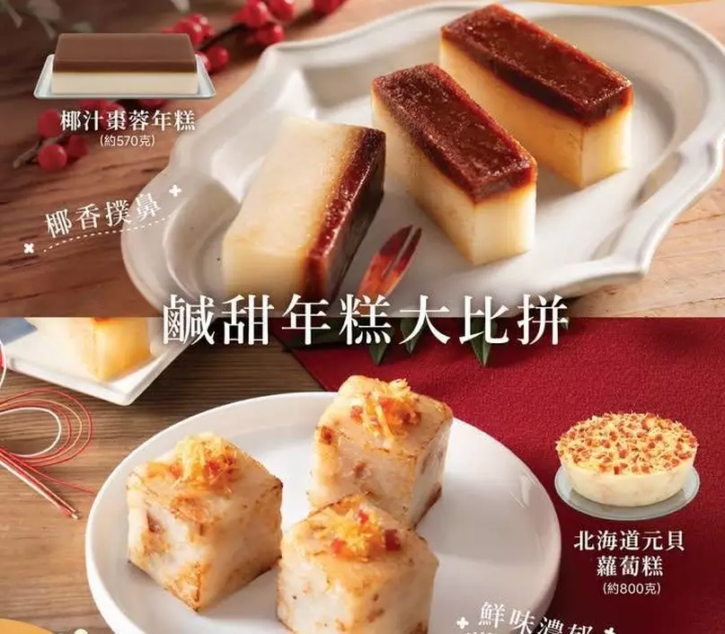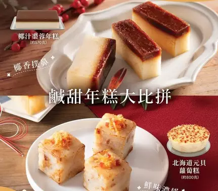 甜味必選的是充滿椰香和棗味的椰汁棗蓉年糕,選用上等糯米粉和椰汁製作,椰香撲鼻,棗味醇厚,是過年歡聚的最佳甜點!👍而想要鮮味濃郁的一定是北海道元貝蘿蔔糕,清甜蘿蔔絲配搭北海道元貝和臘味,口感層次豐富,鮮味大滿足!💯
