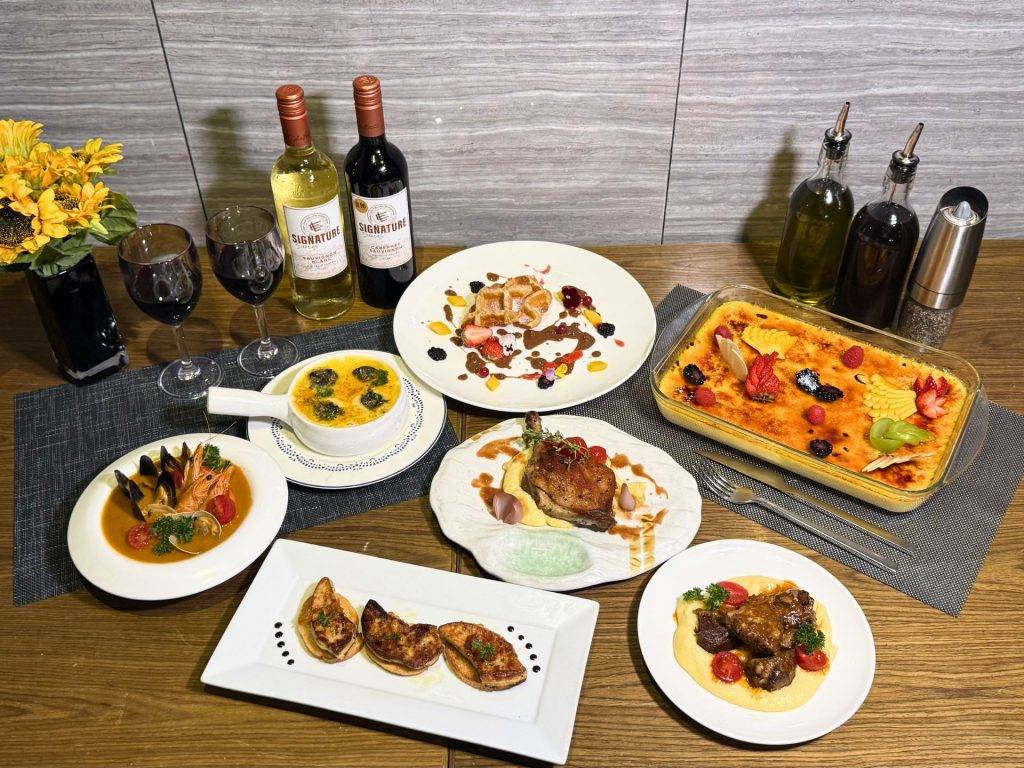 - 法式經典:紅酒鴨肝、布根地紅酒燴牛面頰、馬賽風味龍蝦海鮮燴