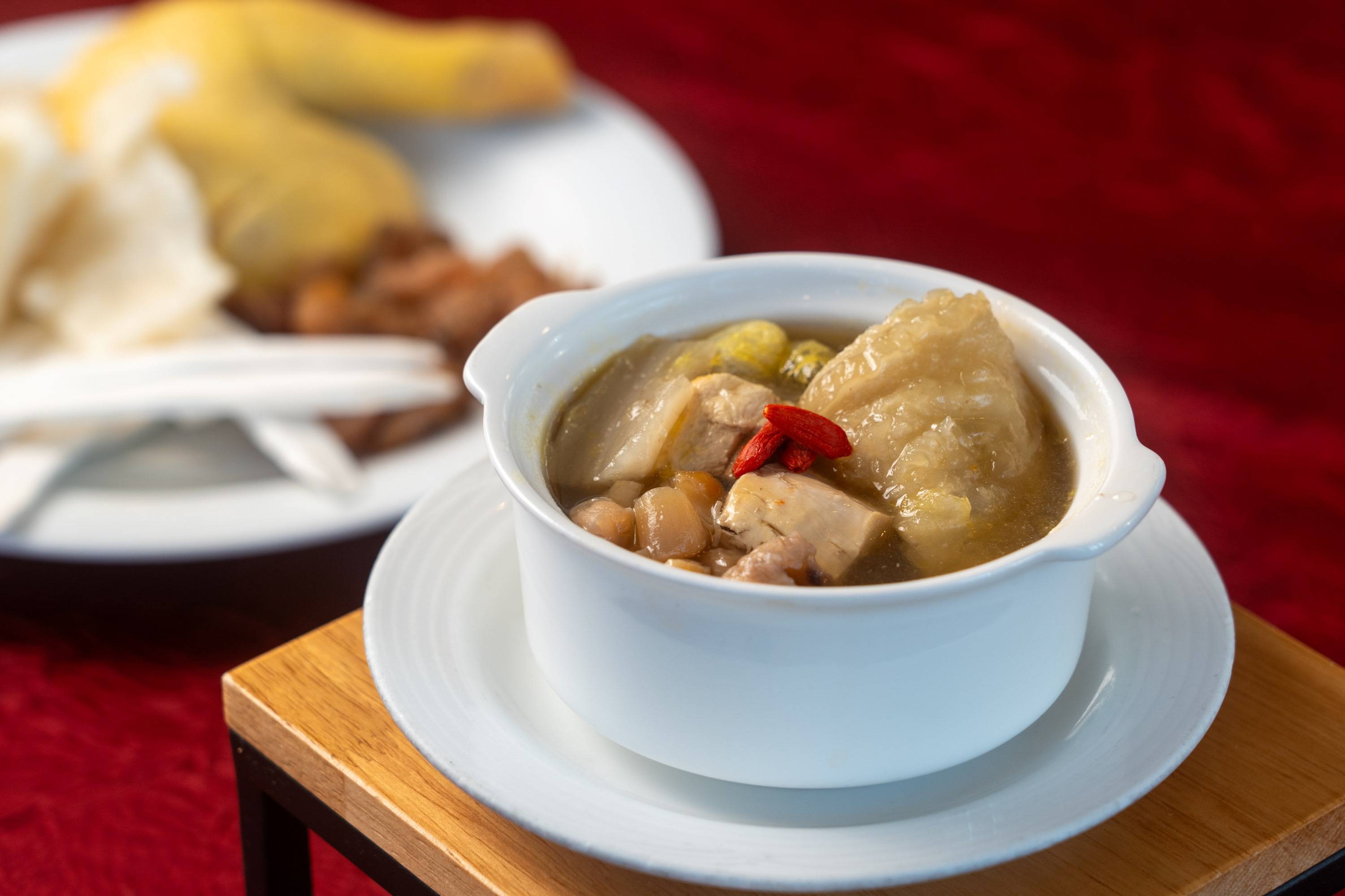 - 尊貴佳餚:鵝肝醬配波特酒凍、鮑魚花膠雞湯、鮑汁海參海螺片