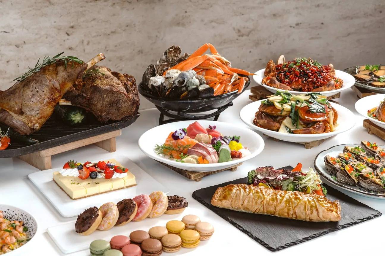 - 海鮮:波士頓龍蝦、蟹腳、阿根廷蝦、泰式涼拌浸花蛤、醉鮑魚