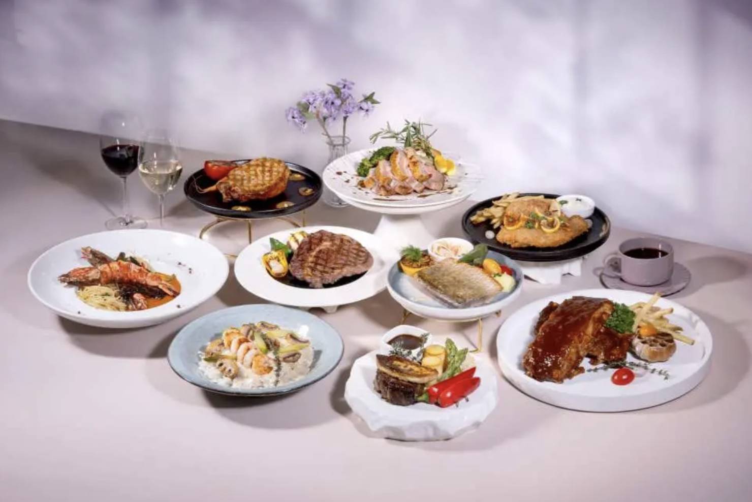 - 經濟之選主菜 (選一款):煎肉眼牛扒配紅酒汁、鮮蝦雜菌意大利飯、維也納炸豬扒配法式芥末燒汁、帆立貝叉燒溏心蛋拉麵
