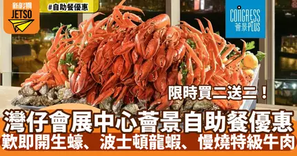 Klook聯同灣仔會展薈景(Congress Plus)推出新春快閃優惠,主打「環球海鮮滋味盛薈」自助晚餐買二送二,折後人均只需HK$417,即可任食即開生蠔、加拿大波士頓龍蝦、長腳蟹及慢燒特級牛肉等環球美食!優惠限時開搶,立即睇內文詳情準備預訂!