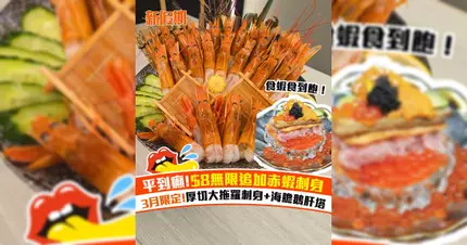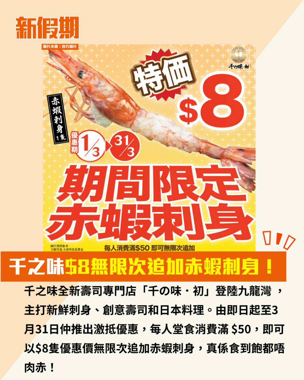千之味全新壽司專門店「千之味.初」登陸九龍灣 ,主打新鮮刺身、創意壽司和日本料理。由即日起至3月31日仲推出激抵優惠,每人堂食消費滿 $50,即可以$8隻優惠價無限次追加赤蝦刺身,真係食到飽都唔肉赤!