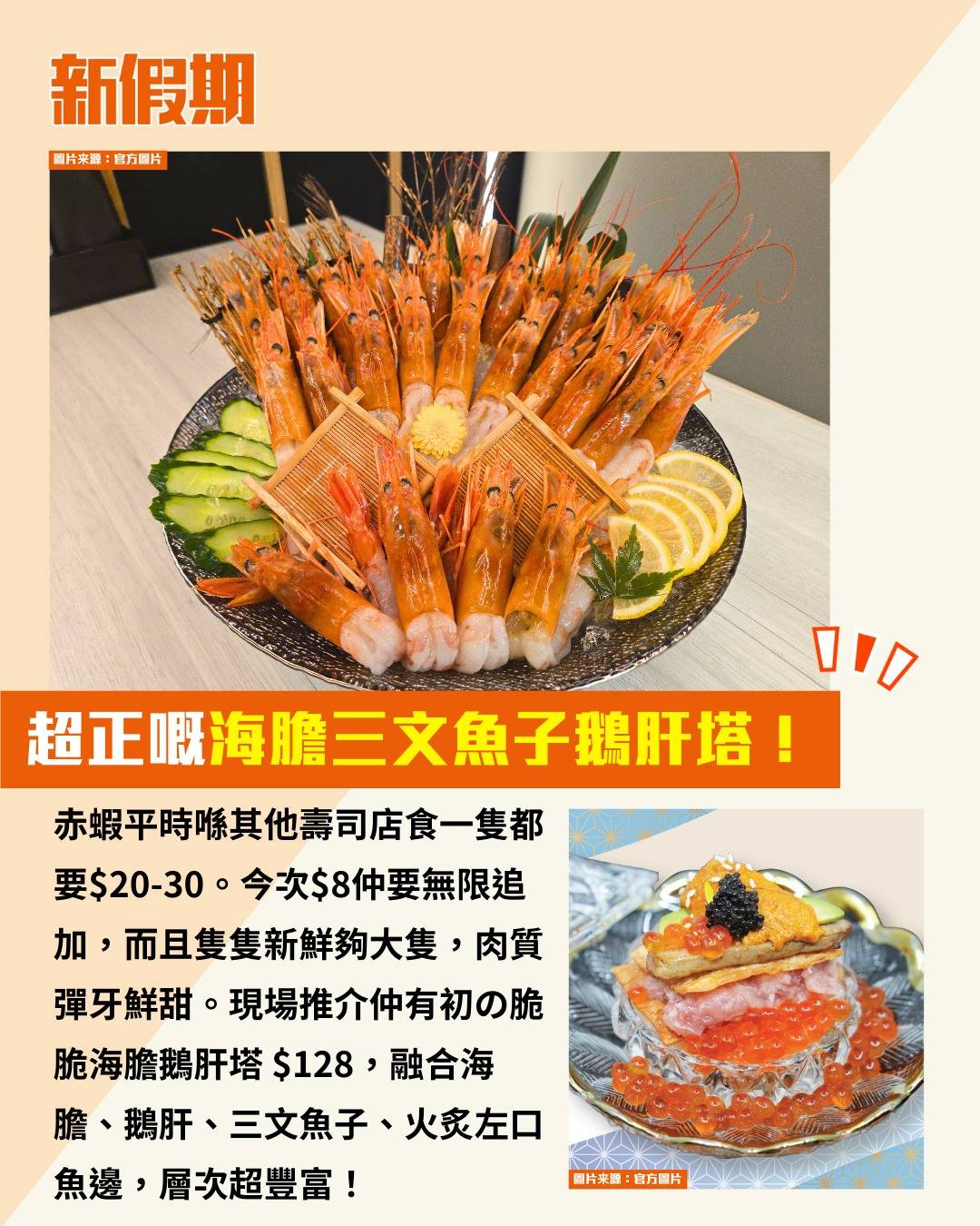 千之味全新壽司專門店「千の味.初」推出抵食優惠!由即日起至3月31日仲推出激抵優惠,每人堂食消費滿 $50,即可以$8隻優惠價無限次追加赤蝦刺身。赤蝦平時喺其他壽司店食一隻都要$20-30。今次$8仲要無限追加,而且隻隻新鮮夠大隻,肉質彈牙鮮甜。現場推介仲有初の脆脆海膽鵝肝塔 $128,融合海膽、鵝肝、三文魚子、火炙左口魚邊,層次超豐富!