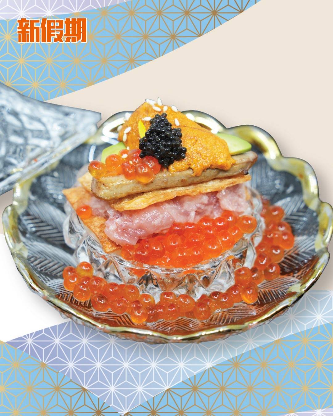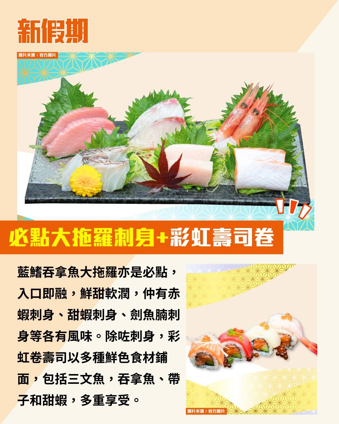 藍鰭吞拿魚大拖羅亦是必點,入口即融,鮮甜軟潤,仲有赤蝦刺身、甜蝦刺身、劍魚腩刺身等各有風味。除咗刺身,彩虹卷壽司以多種鮮色食材鋪面,包括三文魚,吞拿魚、帶子和甜蝦,多重享受。
