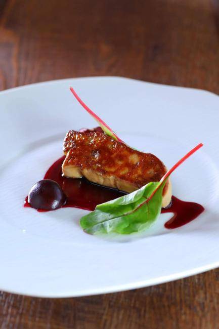 - 鐵板燒法國鵝肝配黑蒜汁