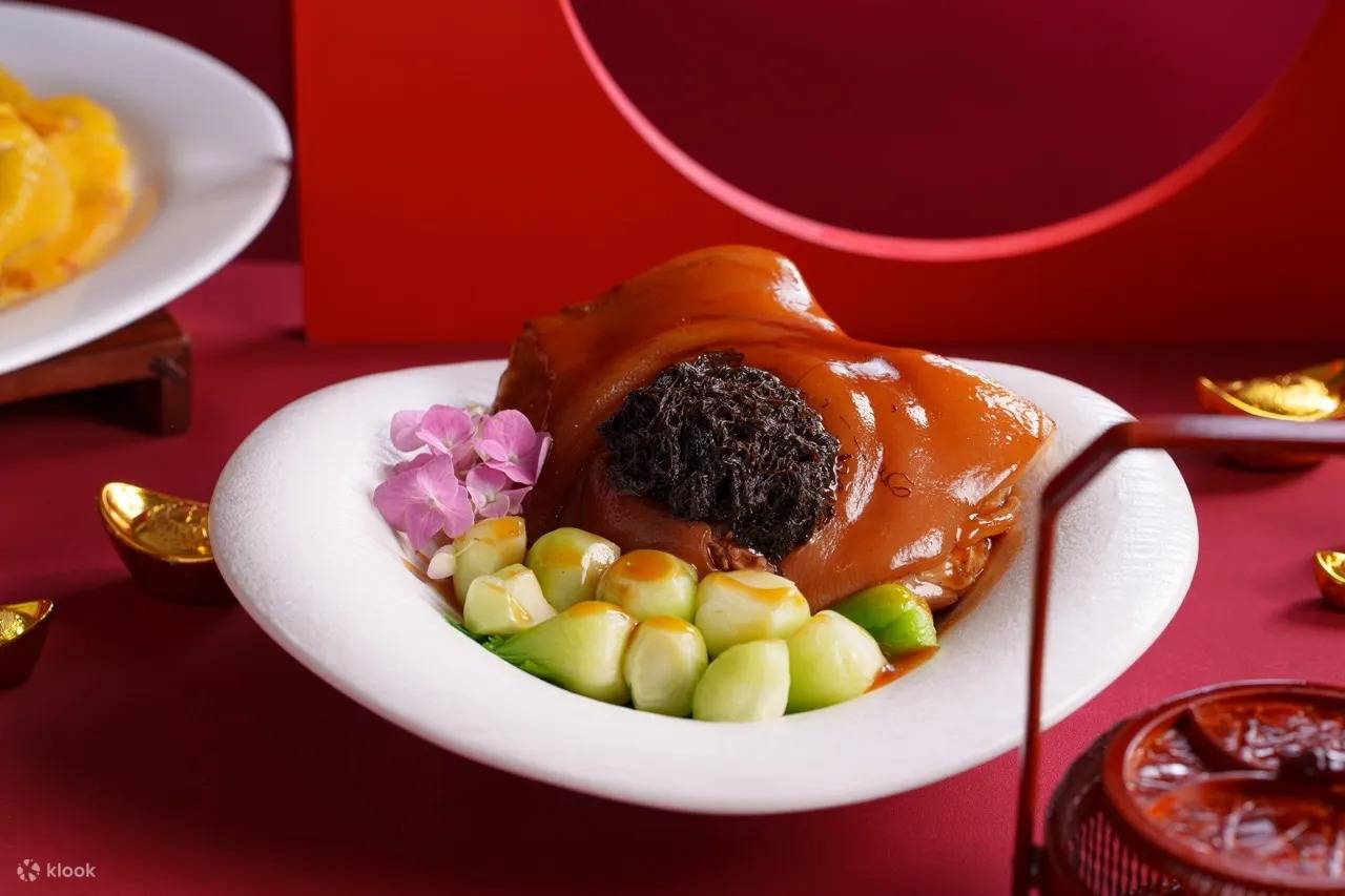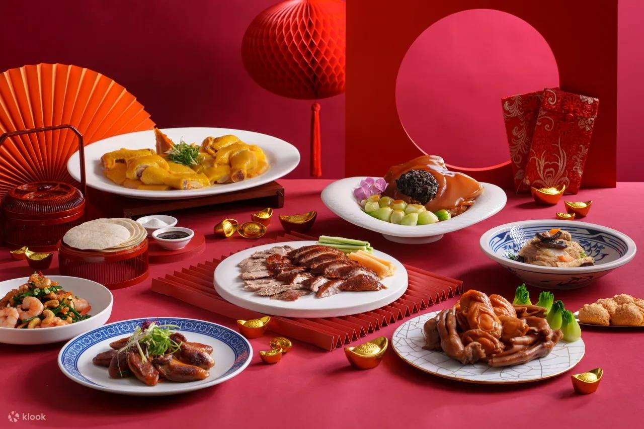 - 主題美食:發財蓮藕⼤利湯⾦雞報喜(⿈油貴妃雞)、橫財就⼿(紅燒元蹄)、三代同堂(蝦⼦蝦乾蝦仁⼩炒王)、⾦銀滿屋(⾦沙海王炒飯)