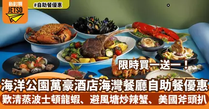 Klook與香港海洋公園萬豪酒店海灣餐廳再度合作,推出「海洋珍味」自助晚餐快閃買一送一優惠,折後自助晚餐人均消費低至HK$467,即可無限品嚐清蒸波士頓龍蝦、避風塘炒辣蟹、美國斧頭扒及多款海洋主題美食。立即查看下方優惠詳情,準時開搶!