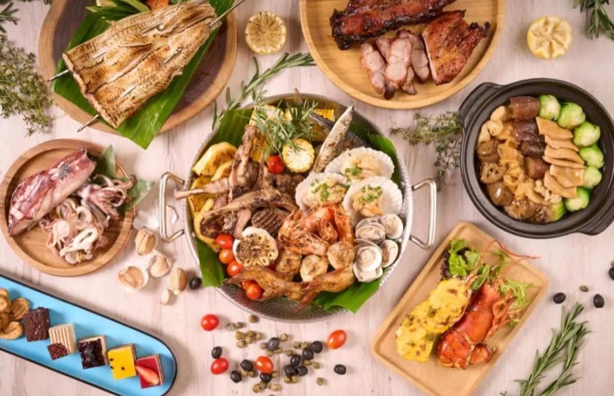 - 炭烤區:蒜香扇貝、原隻照燒魷魚、鹽燒白鱔、原隻炭烤乳豬(週末及公眾假期供應)