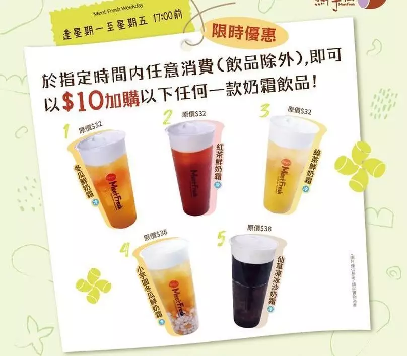 - 優惠詳情:任意消費即可以$10加購奶霜飲品一杯
