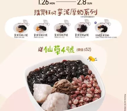 • 優惠詳情:購買任何芋泥厚奶系列產品,即送仙草4號一碗