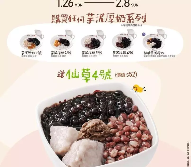 🤩1月26日起至2月8日,凡購買任何芋泥厚奶系列產品,即送仙草4號一碗(價值$52)