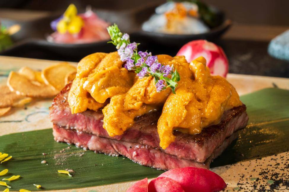 - 主菜:澳洲海膽炒極品松本 A5 和牛、練海膽醬燒澳洲龍蝦