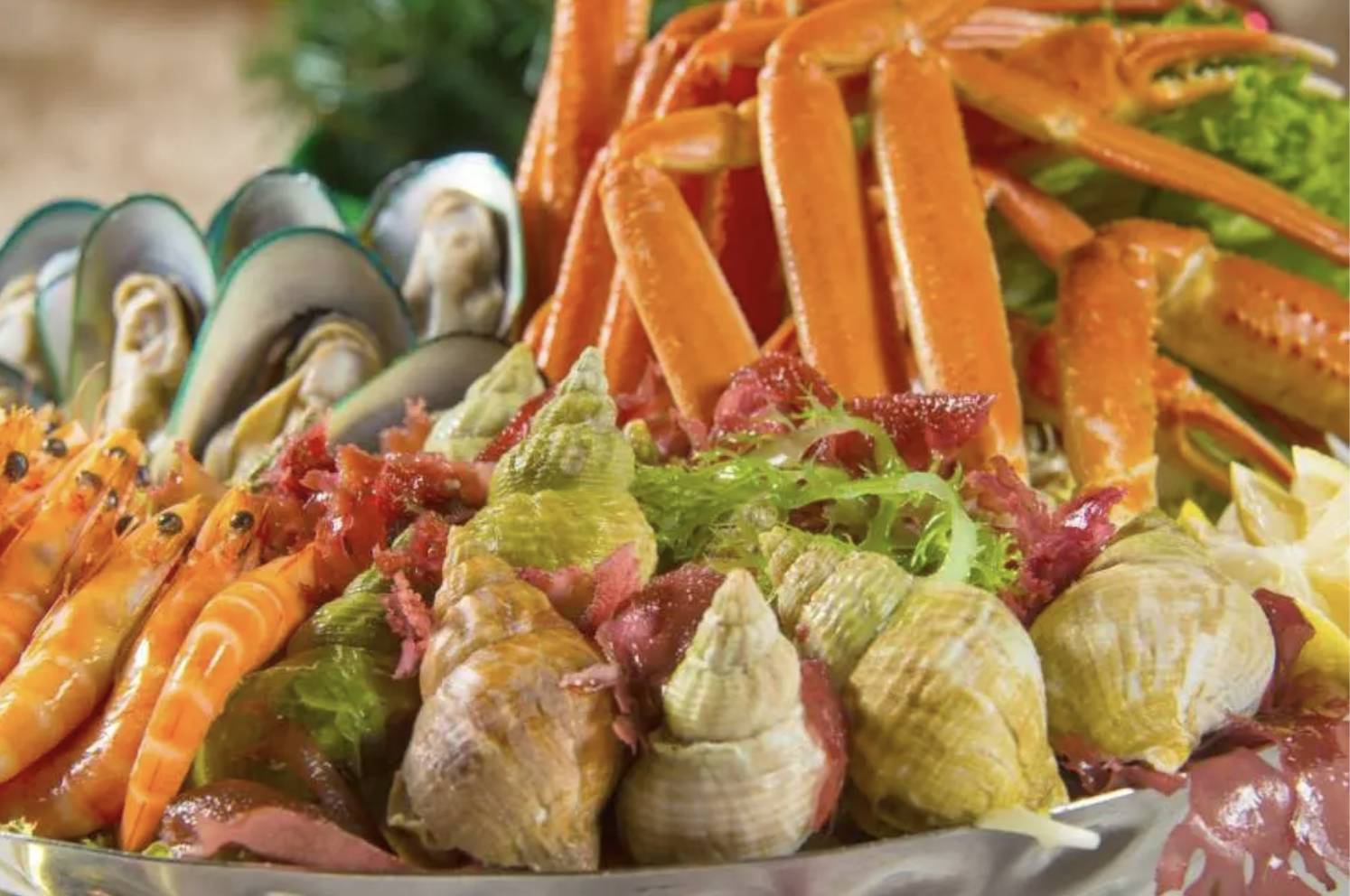 - 海鮮:雪花蟹腳、翡翠螺、熟蝦、青口