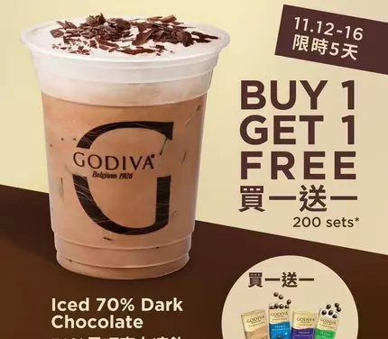 2025年11月12至16日,於香港GODIVA專門店^購買70%黑巧克力凍飲,即可享買一送一優惠*!贈送之凍飲可即時享用或以換領券形式領取。