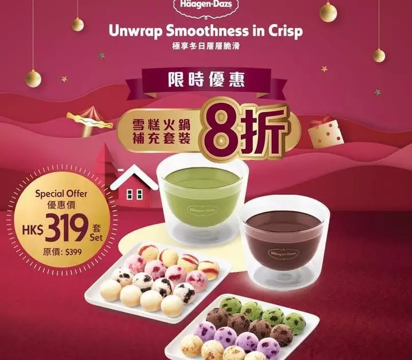 Häagen-Dazs™ 雪糕火鍋 限時優惠‼️😳 由即日起至12月21… 飲食優惠 新假期編輯部 Jan 16 2026 廣告 Häagen-Dazs™ 雪糕火鍋 限時優惠‼️😳 閱讀全文 由即日起至12月21日,Häagen-Dazs™ 雪糕火鍋 補充套裝 限時八折優惠*😍 補充套裝仲分別有朱古力醬同埋開心果醬添呀!🤤快啲買嚟過一個暖笠笠嘅聖誕啦!☺️ *優惠只適用於 Häagen-Dazs™ 實體專門店,圖片只供參考,數量有限,售完即止!優惠受條款及細則約束。 #HaagenDazs #HaagenDazsHK #雪糕火鍋 #聖誕節 #優惠 (圖片來源:Facebook@HaagenDazsHK) 開始日期:即日 結束日期:2026-12-21 地點:喜茶 優惠詳情:雪糕火鍋補充套裝限時八折優惠 關鍵詞Haagen-Dazsjetsohub飲食優惠 圖片來源:圖片來源:Facebook@HaagenDazsHK