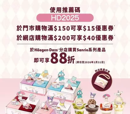 Häagen-Dazs™️會員現憑推廣碼 “HD2025”登記成Sanrio Smile HK App 會員,除以上迎新優惠,更可享額外會員福利#!👀