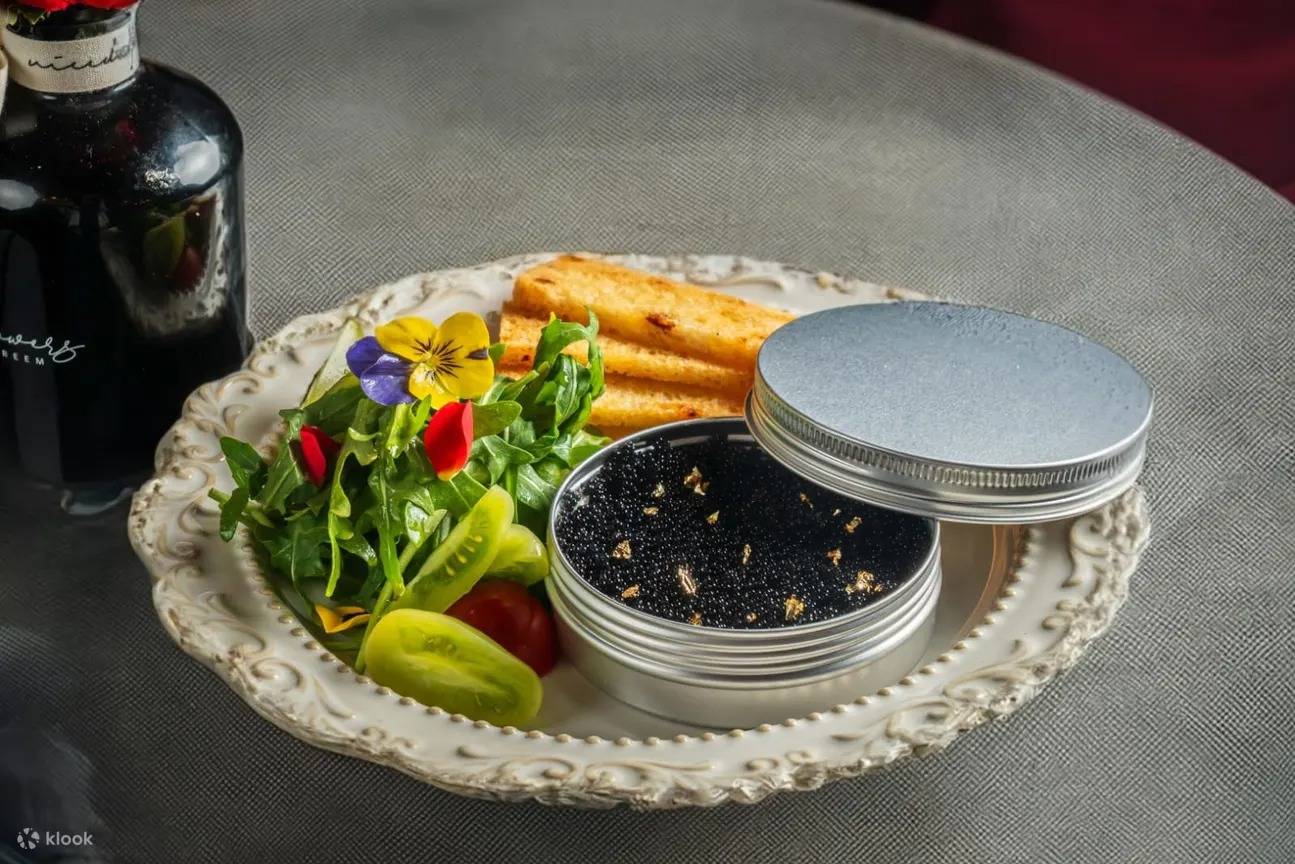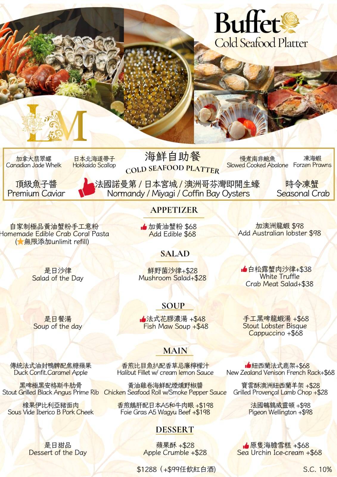 - 任食海鮮:加拿大翡翠螺、日本北海道帶子、慢煮南非鮑魚、頂級魚子醬、時令凍蟹