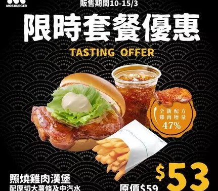 • 優惠詳情:照燒雞肉漢堡套餐優惠,只需$53