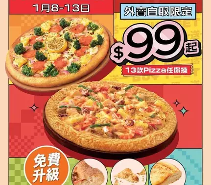 咁抵得唔得㗎?1月8號起至1月13號,只要喺Pizza Hut 門市落單🍕外賣自取Pizza就有買一送一優惠🤩$99起試勻兩款口味,足足有13款pizza任你揀!仲有手工酸種批、鬆厚批同爆脆批3款批邊免費升級,又或者加錢升級芝心/ 芝脆批邊都得🧀即刻嗌埋朋友/同事齊齊開心share: