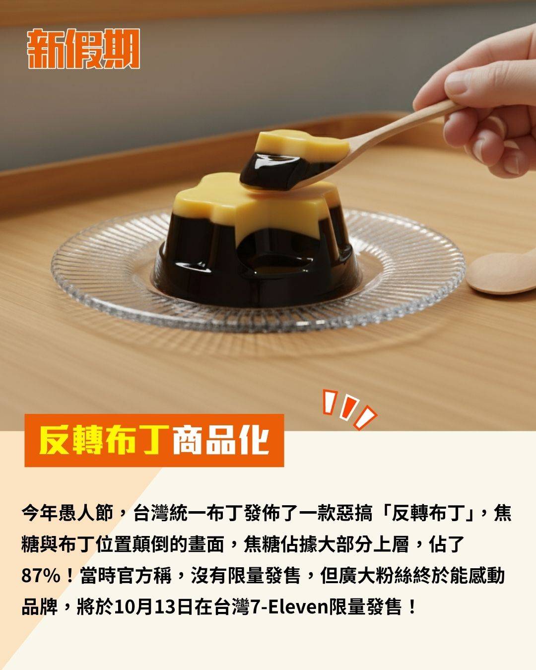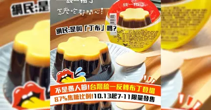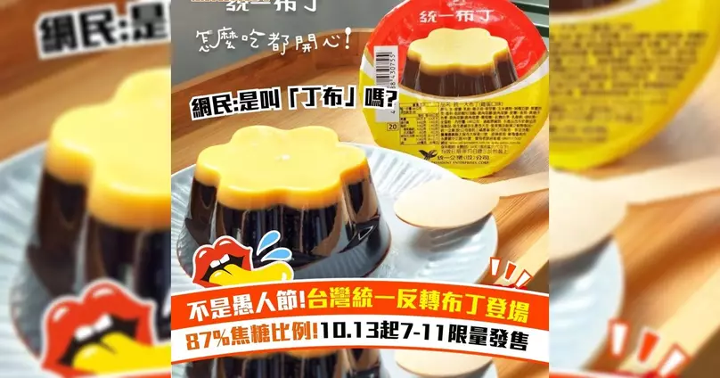 今年愚人節,台灣統一布丁發佈了一款惡搞「反轉布丁」,焦糖與布丁位置顛倒的畫面,焦糖佔據大部分上層,佔了87%!當時官方稱,沒有限量發售,但廣大粉絲終於能感動品牌,將於10月13日在台灣7-Eleven限量發售!