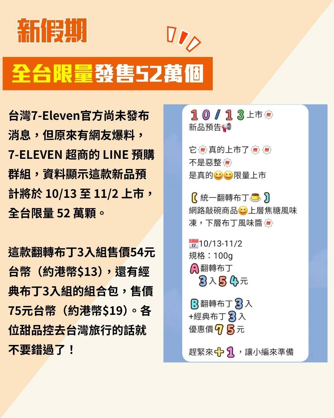 台灣7-Eleven官方尚未發布消息,但原來有網友爆料,7-ELEVEN 超商的 LINE 預購群組,資料顯示這款新品預計將於 10/13 至 11/2 上市,全台限量 52 萬顆。