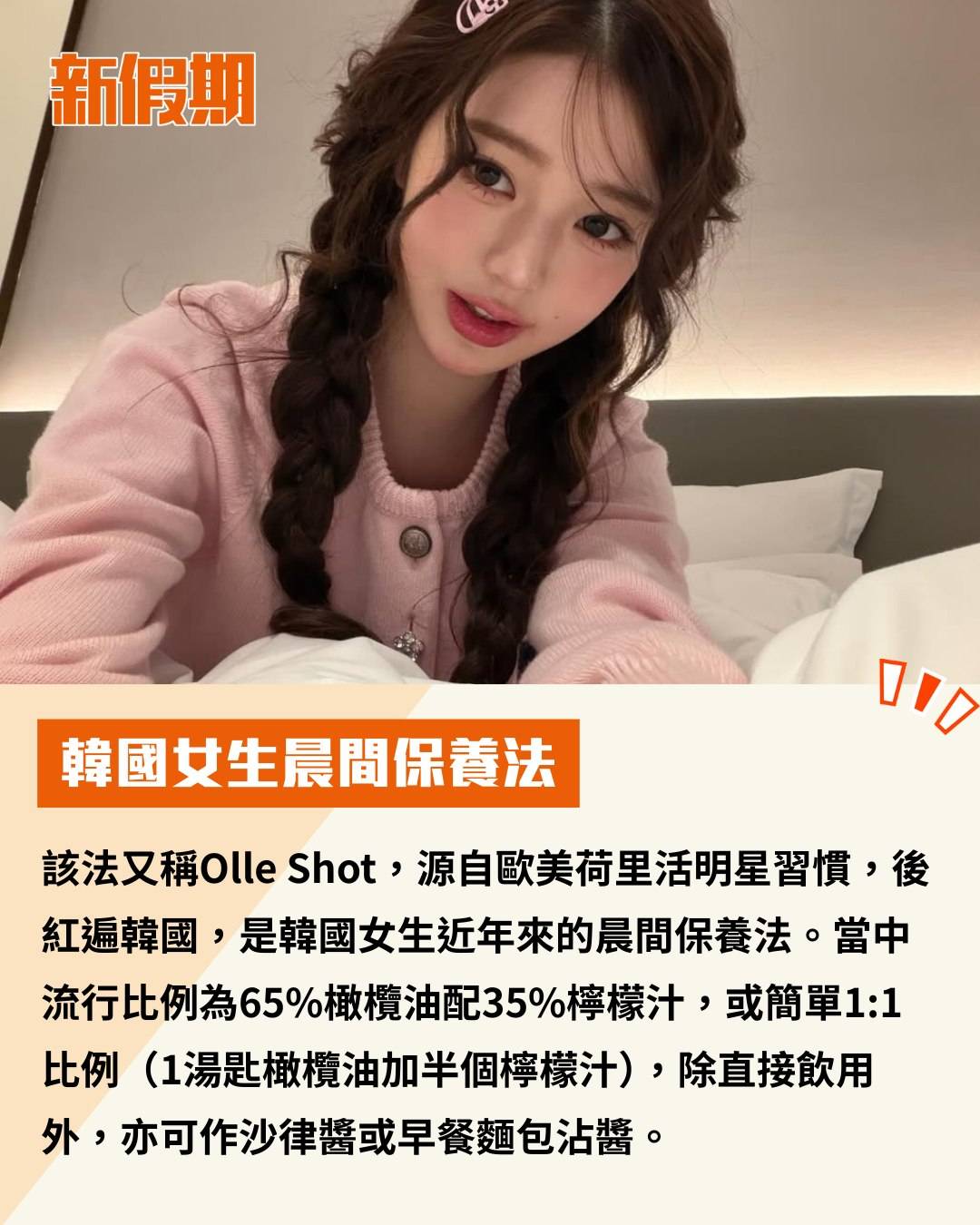 該法又稱Olle Shot,源自歐美荷里活明星習慣,後紅遍韓國,是韓國女生近年來的晨間保養法。當中流行比例為65%橄欖油配35%檸檬汁,或簡單1:1比例(1湯匙橄欖油加半個檸檬汁),除直接飲用外,亦可作沙律醬或早餐麵包沾醬。