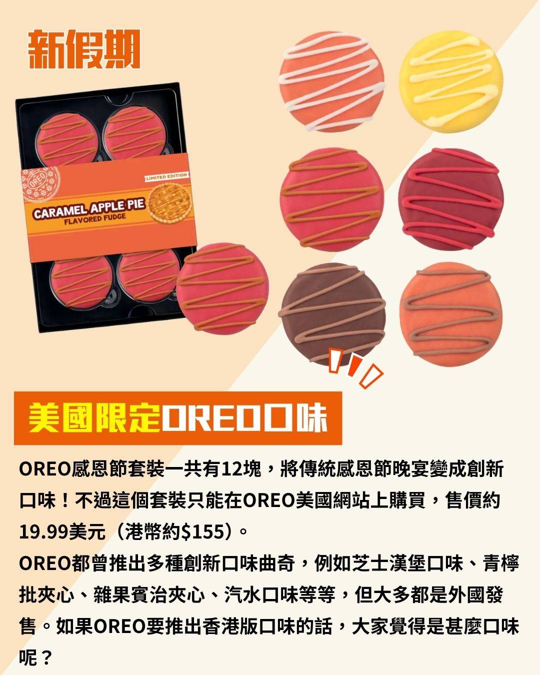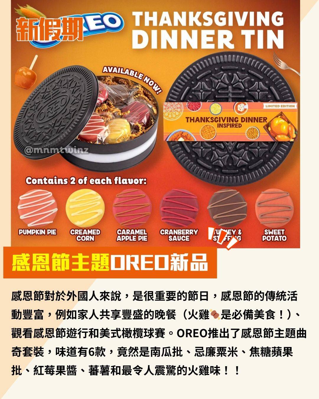 感恩節對於外國人來說,是很重要的節日,感恩節的傳統活動豐富,例如家人共享豐盛的晚餐(火雞🍖是必備美食!)、觀看感恩節遊行和美式橄欖球賽。OREO推出了感恩節主題曲奇套裝,味道有6款,竟然是南瓜批、忌廉粟米、焦糖蘋果批、紅莓果醬、蕃薯和最令人震驚的火雞味!!