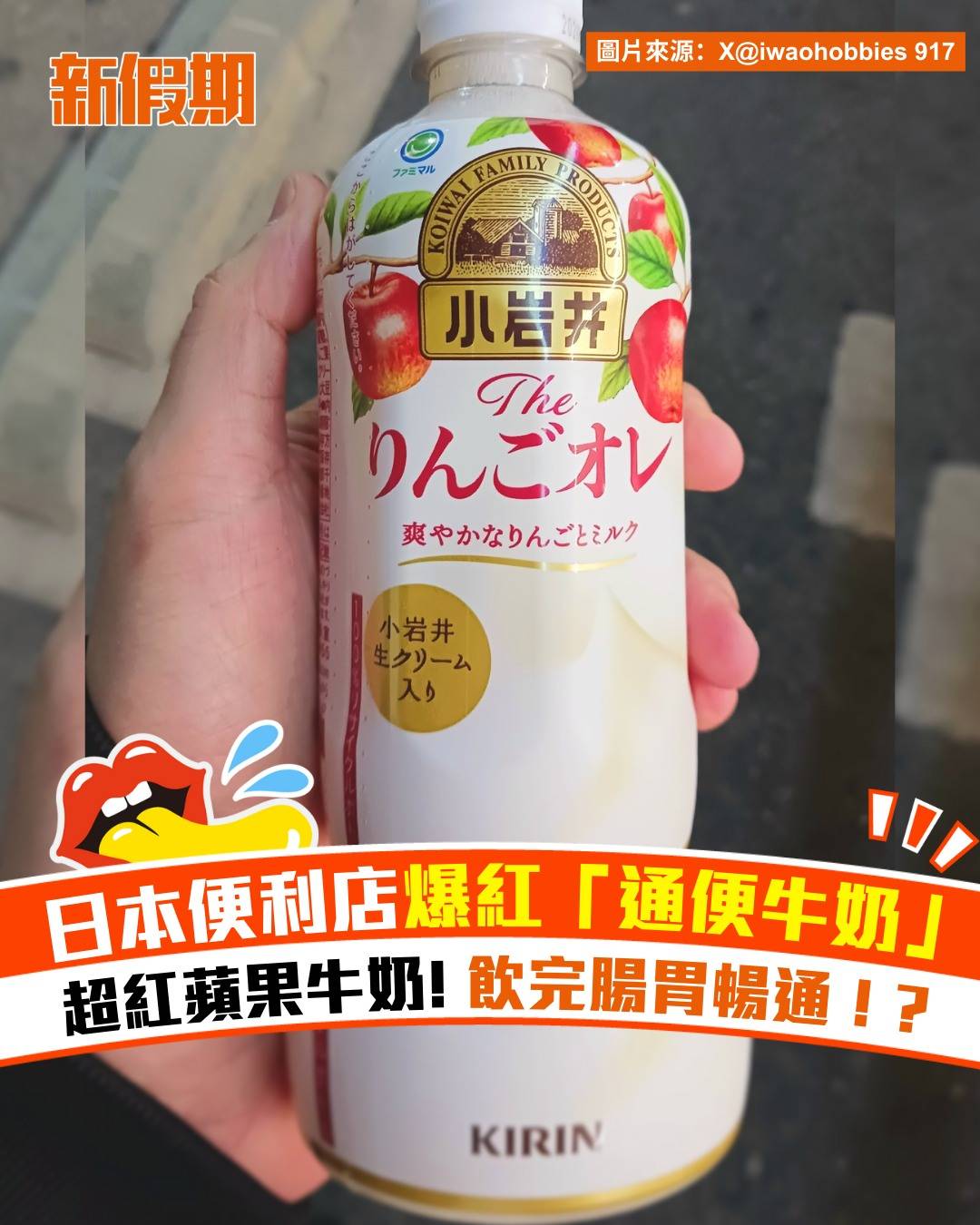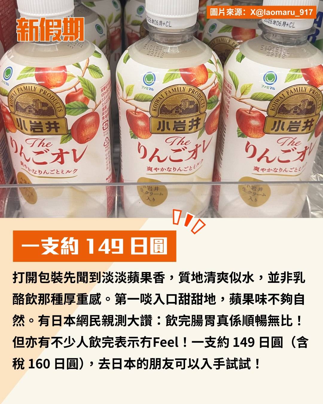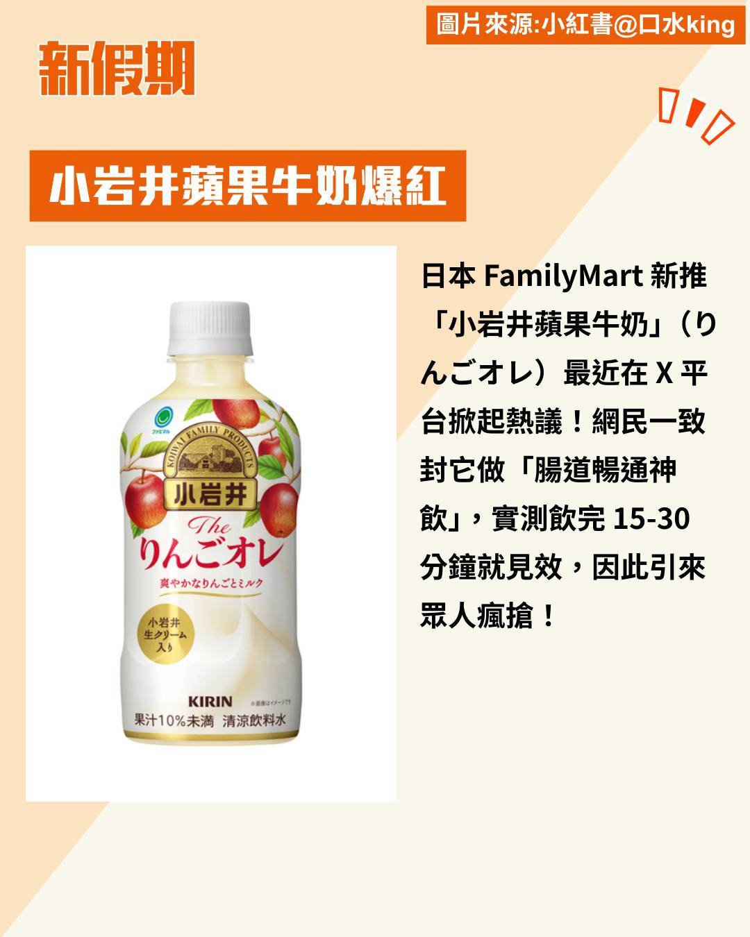 日本 FamilyMart 新推「小岩井蘋果牛奶」(りんごオレ)最近在 X 平台掀起熱議!網民一致封它做「腸道暢通神飲」,實測飲完 15-30 分鐘就見效,因此引來眾人瘋搶!