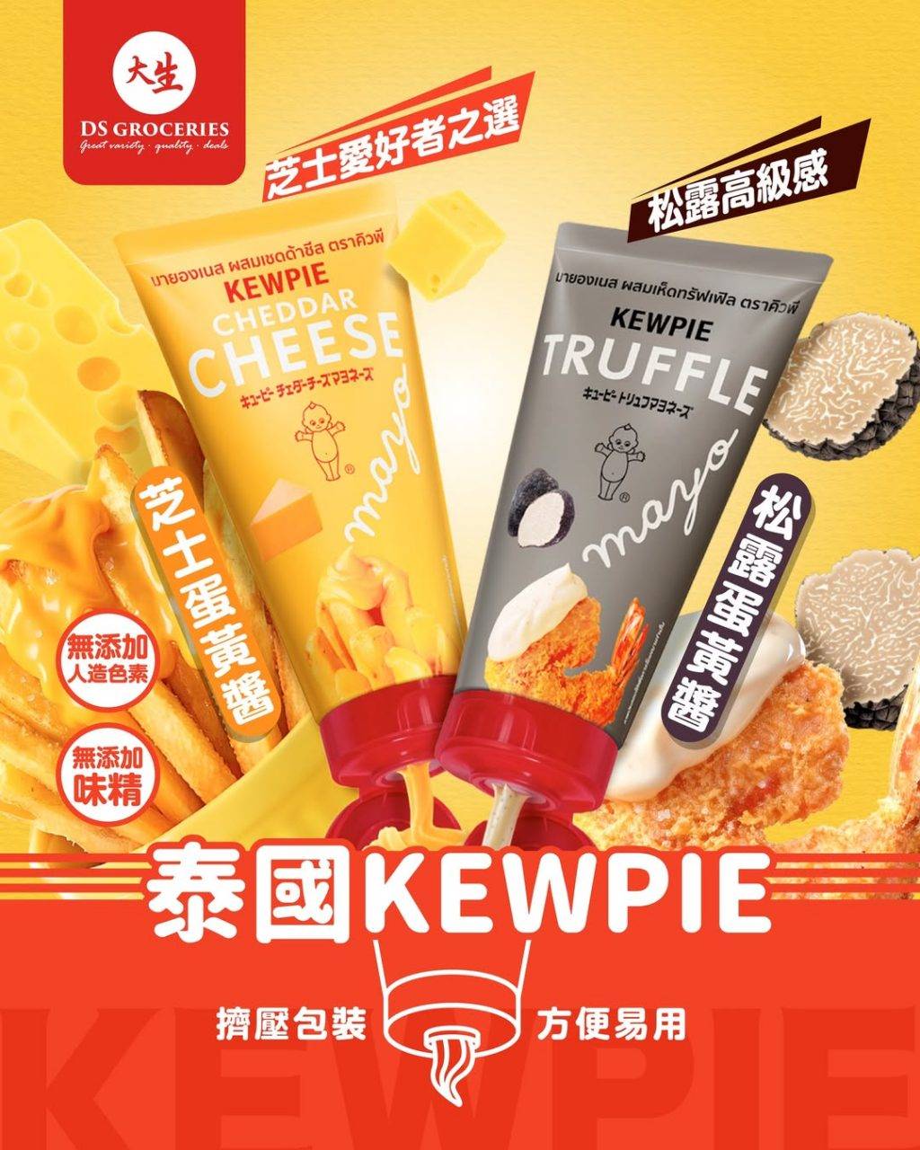 泰國人氣手信KEWPIE蛋黃醬終於登陸香港啦!大生生活超市最近引入兩款新口味:松露蛋黃醬同芝士蛋黃醬,口感濃郁超邪惡。好多網民大讚,用嚟撈薯條、做三文治、蘸炸物都勁搭!90g細支只售$20,方便帶返工或者野餐,性價比爆燈!