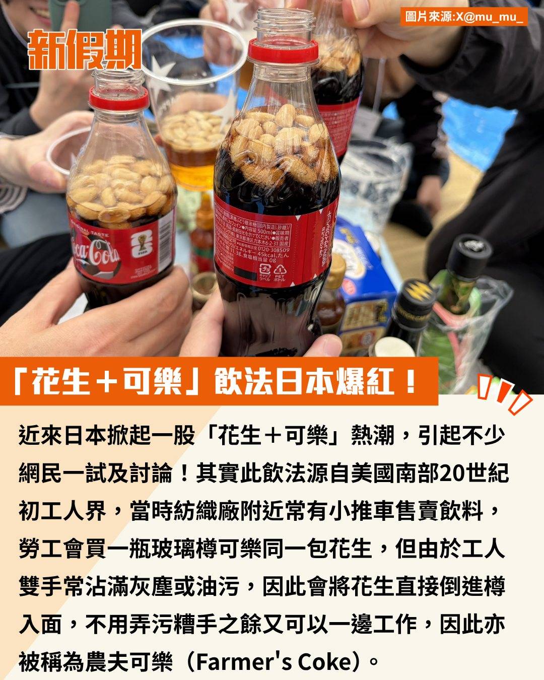 近來日本掀起一股「花生+可樂」熱潮,引起不少網民一試及討論!其實此飲法源自美國南部20世紀初工人界,當時紡織廠附近常有小推車售賣飲料,勞工會買一瓶玻璃樽可樂同一包花生,但由於工人雙手常沾滿灰塵或油污,因此會將花生直接倒進樽入面,不用弄污糟手之餘又可以一邊工作,因此亦被稱為農夫可樂(Farmer’s Coke)。