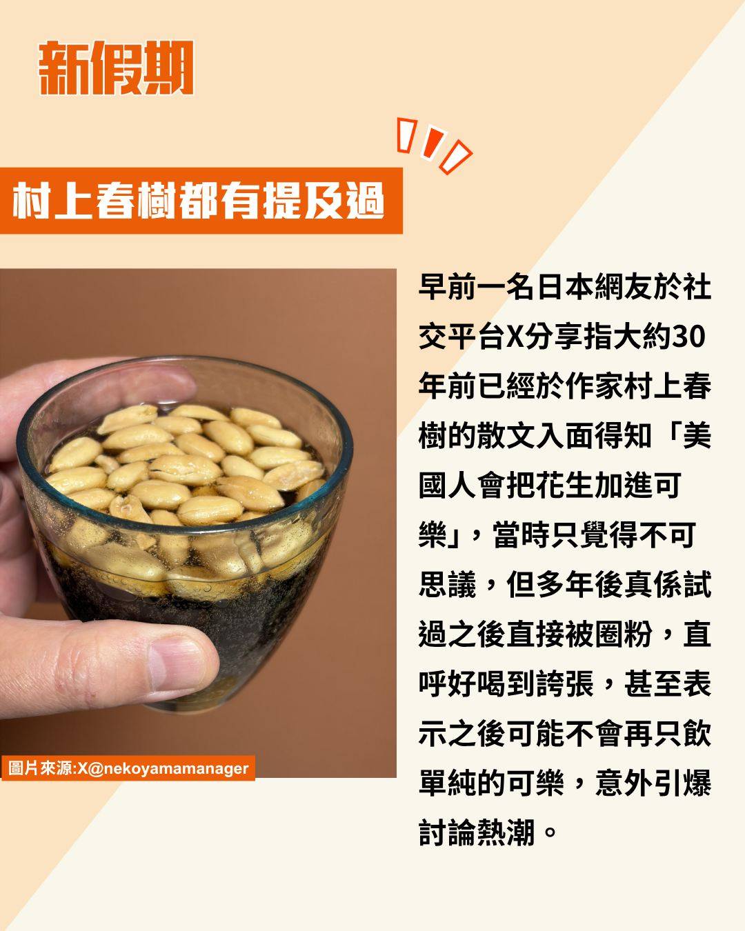 早前一名日本網友於社交平台X分享指大約30年前已經於作家村上春樹的散文入面得知「美國人會把花生加進可樂」,當時只覺得不可思議,但多年後真係試過之後直接被圈粉,直呼好喝到誇張,甚至表示之後可能不會再只飲單純的可樂,意外引爆討論熱潮。