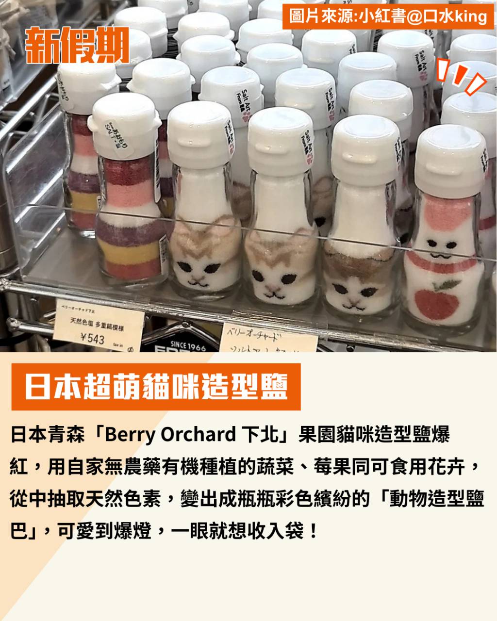 日本青森Berry Orchard 下北果園貓咪造型鹽爆紅,用自家無農藥有機種植的蔬菜、莓果同可食用花卉,從中抽取天然色素,變出成瓶瓶彩色繽紛的「動物造型鹽巴」,可愛到爆燈,一眼就想收入袋!