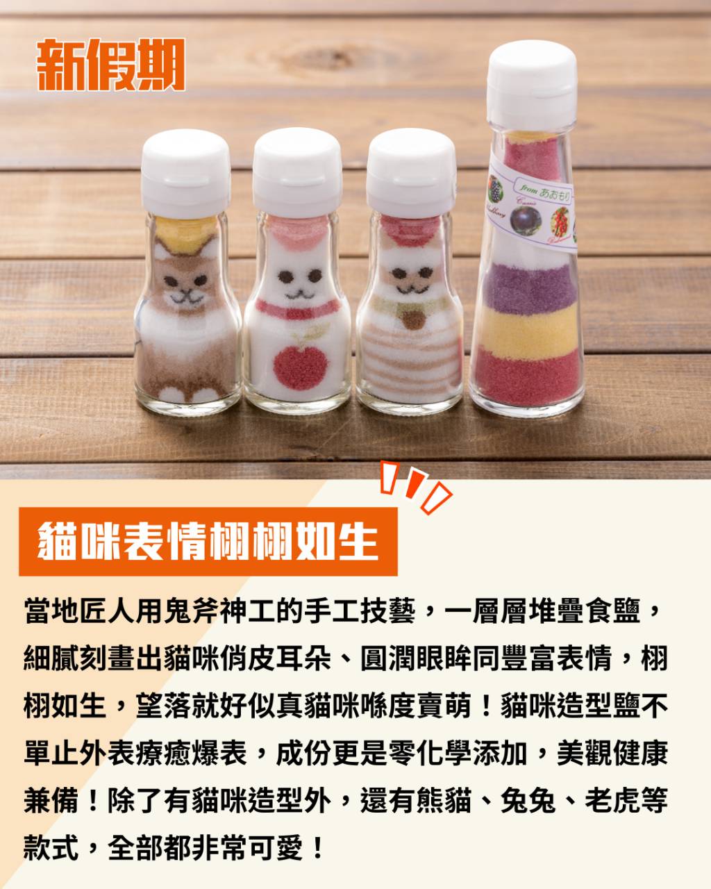 當地匠人用鬼斧神工的手工技藝,一層層堆疊食鹽,細膩刻畫出貓咪俏皮耳朵、圓潤眼眸同豐富表情,栩栩如生,望落就好似真貓咪喺度賣萌!貓咪造型鹽不單止外表療癒爆表,成份更是零化學添加,美觀健康兼備!除了有貓咪造型外,還有熊貓、兔兔、老虎等款式,全部都非常可愛!