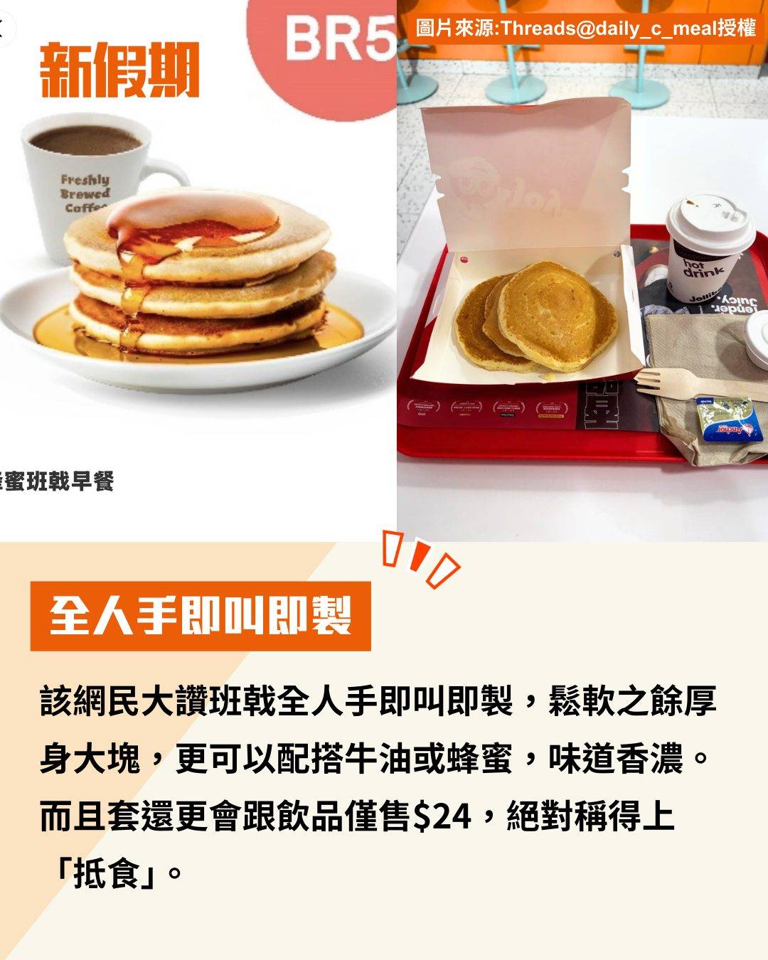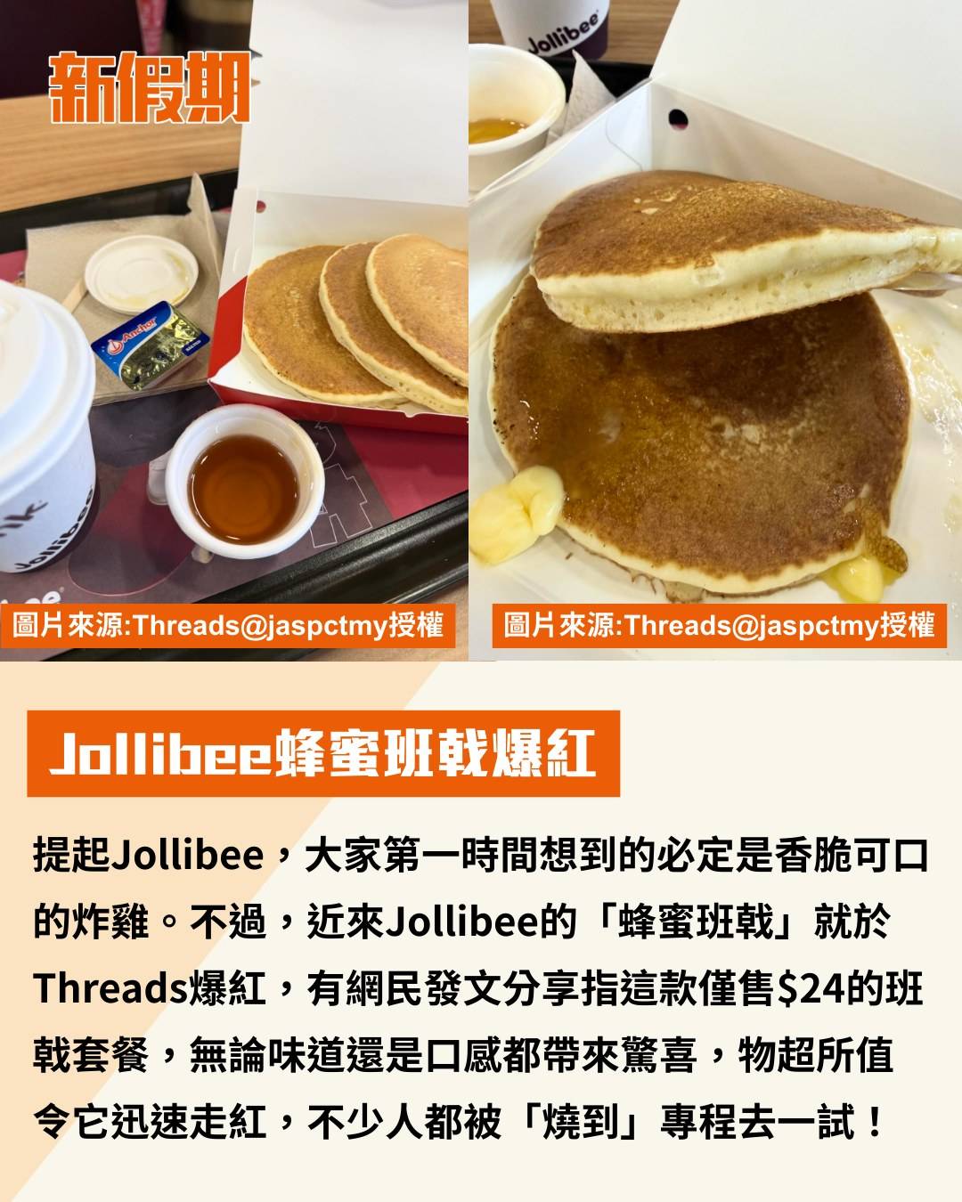 提起Jollibee,大家第一時間想到的必定是香脆可口的炸雞。不過,近來Jollibee的「蜂蜜班戟」就於Threads爆紅,有網民發文分享指這款僅售$24的班戟套餐,無論味道還是口感都帶來驚喜,物超所值令它迅速走紅,不少人都被「燒到」專程去一試!