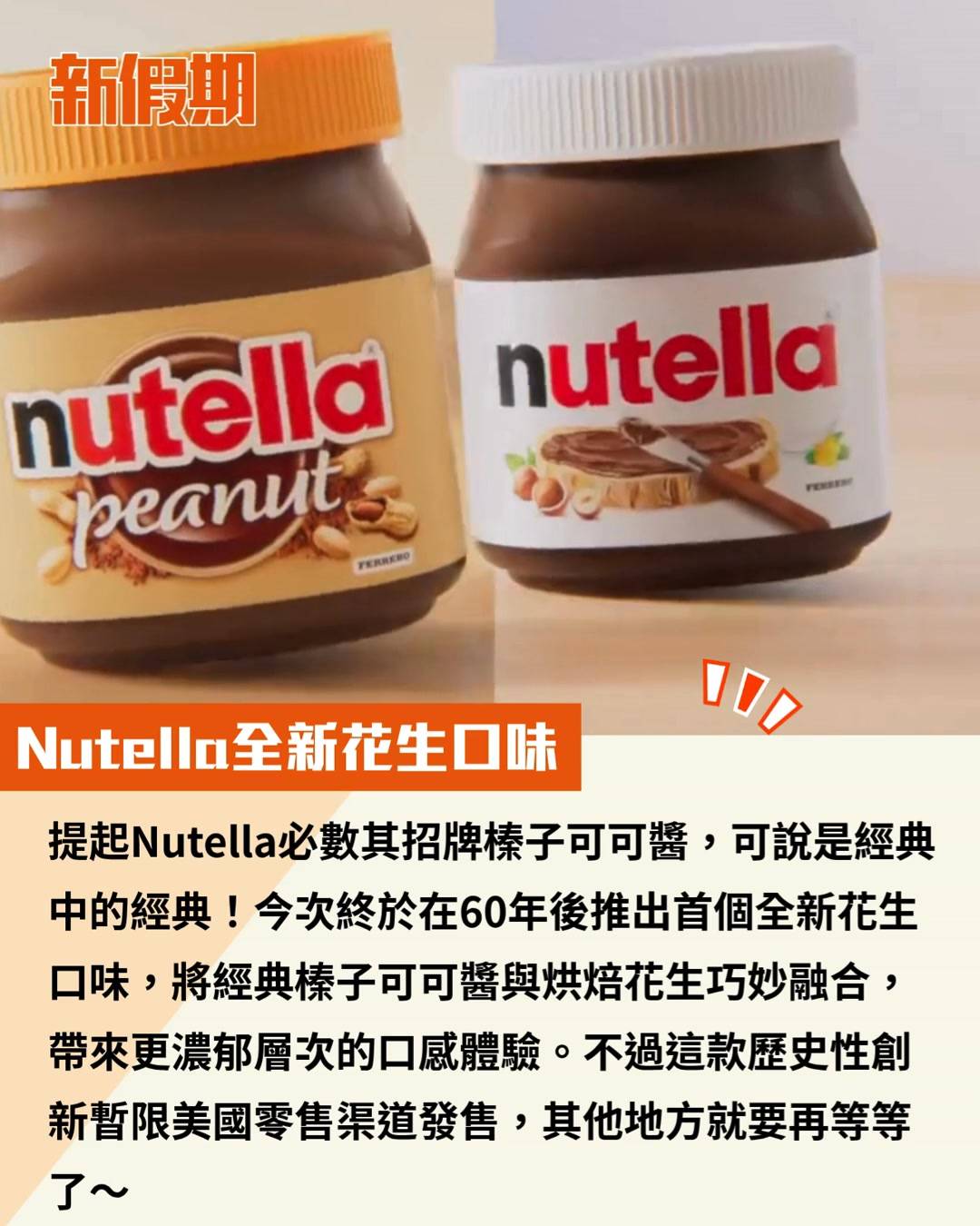 提起Nutella必數其招牌榛子可可醬,可說是經典中的經典!今次終於在60年後推出首個全新花生口味,將經典榛子可可醬與烘焙花生巧妙融合,帶來更濃郁層次的口感體驗。不過這款歷史性創新暫限美國零售渠道發售,其他地方就要再等等了~