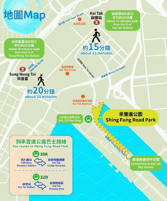 「樂在承豐・動樂無限」活動舉行期間,公園內會有 3 個指定點放置了「明信片任務」印章,每個印章刻劃了以承豐道公園設施設計的圖像,集齊 3 個印章即可拼湊出完整的主題圖案,極具紀念價值。另外為了紀念園區由啟德機場舊跑道升級變身,特設「隱藏打卡點」,在觀景台放置了可愛的飛機元素打卡裝置,向啟德的輝煌歷史致敬,大家更可帶同心愛的公仔或到來打卡留念!活動舉行當日將設每 20 分鐘一班的寵物友善免費接駁巴士,方便市民輕鬆前往參與活動。