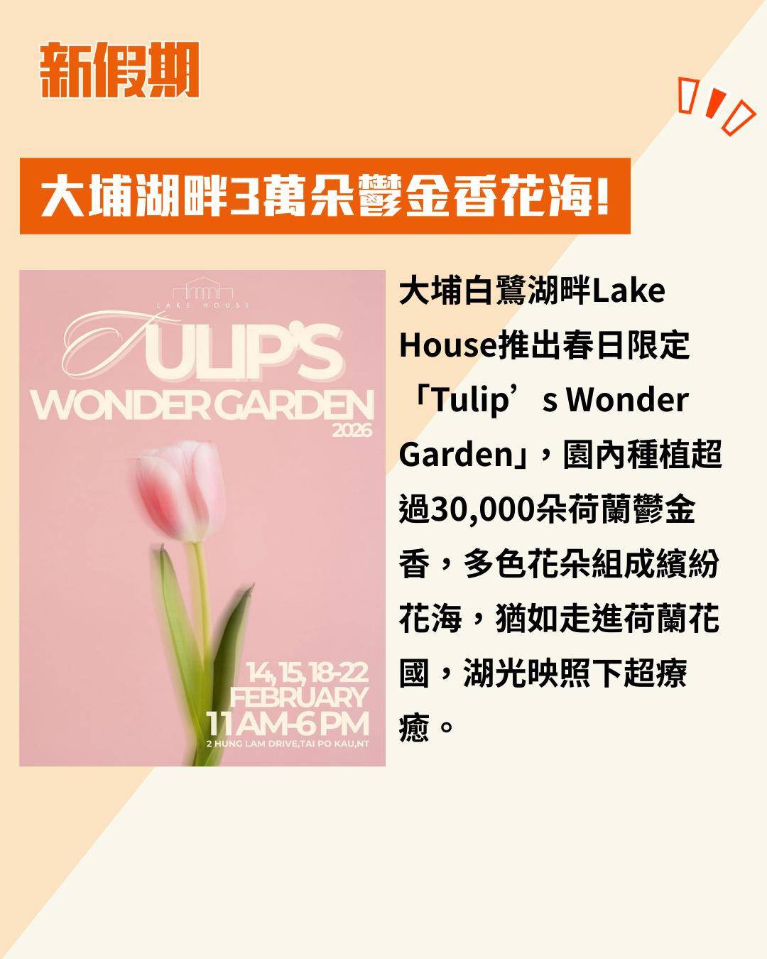 大埔白鷺湖畔Lake House推出春日限定「Tulip’s Wonder Garden」,園內種植超過30,000朵荷蘭鬱金香,多色花朵組成繽紛花海,猶如走進荷蘭花國,湖光映照下超療癒。